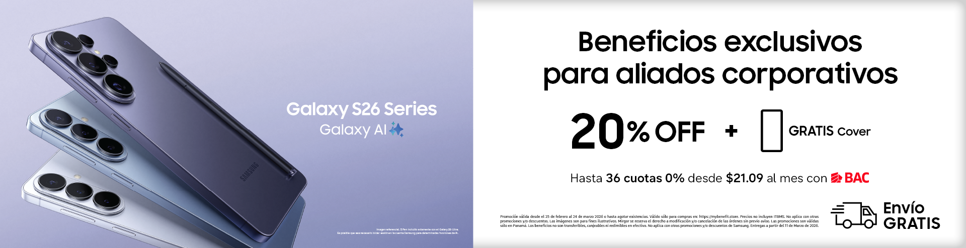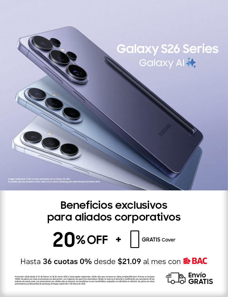 Promoción válida desde el 25 de febrero al 24 de marzo 2026 o hasta agotar existencias. Válido sólo para compras en: https://mybenefit.store. Precios no incluyen ITBMS. No aplica con otras promociones y/o descuentos. Las imágenes son para fines ilustrativos. Mirgor se reserva el derecho a modificación y/o cancelación de las órdenes sin previo aviso. Las promociones son válidas sólo en Panamá. Los beneficios no son transferibles, canjeables ni redimibles en efectivo. No aplica con otras promociones y/o descuentos de Samsung. Entregas a partir del 11 de Marzo de 2026.